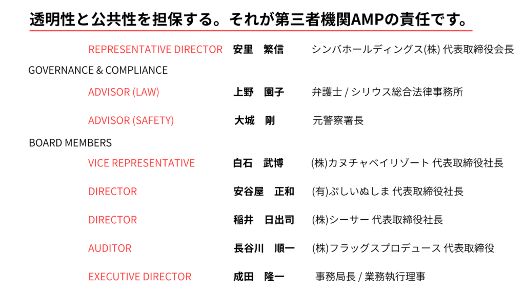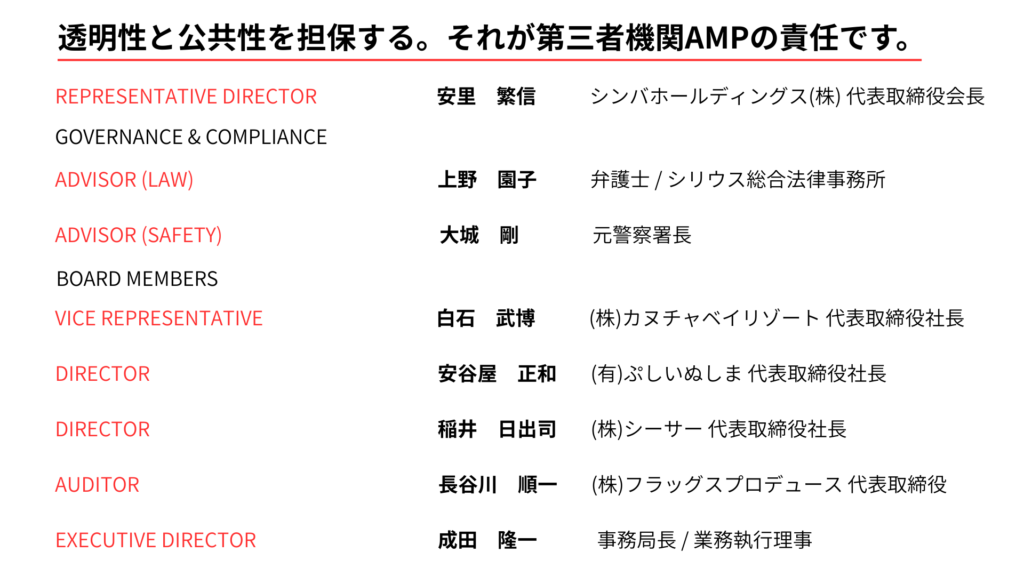 AMPは、独立したガバナンス体制のもと、特定の利益団体に偏らない公正な立場を貫きます。弁護士や元警察関係者、業界リーダーらが名を連ね、沖縄の海の公共性を守り抜きます。