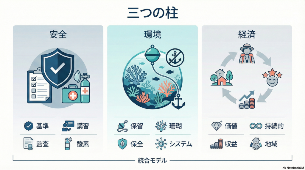 3. 地域経済(Economy):持続的な価値を創る 安全で質の高い体験は、客単価の向上とリピーターの増加に直結します。短期的な消費型観光から、地域に富が還元される持続可能な観光モデルへの転換を目指します。
