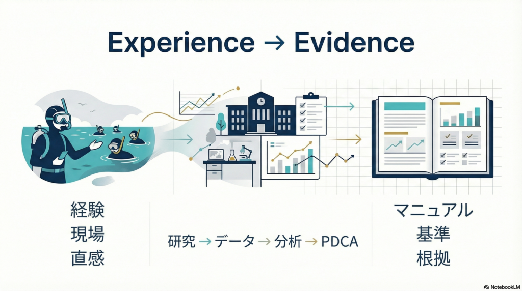 公立大学法人 名桜大学(遠矢英憲上級准教授)との共同研究 AMPは、野外教育学の専門知見を取り入れ、現場のプロが培ってきた「体験知」を「形式知(具体的な数値やマニュアル)」へと変換しています。水辺活動の安全教育とマネジメントに関する学術的検証を通じ、業界全体の健全化を支える科学的根拠(エビデンス)を構築しました。