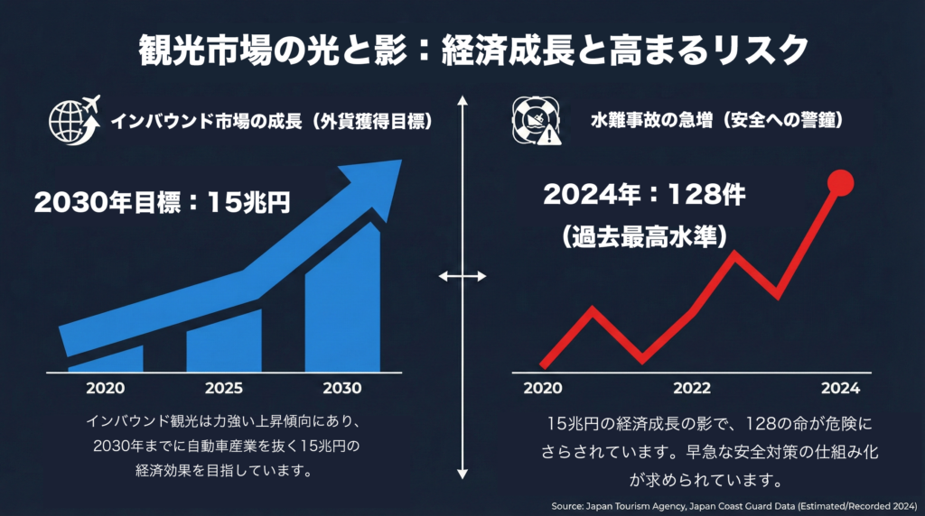 政府が掲げる「2030年インバウンド外貨獲得15兆円」という目標。その光の裏側で、2024年、沖縄の水難事故は128件という過去最高水準を記録しました。