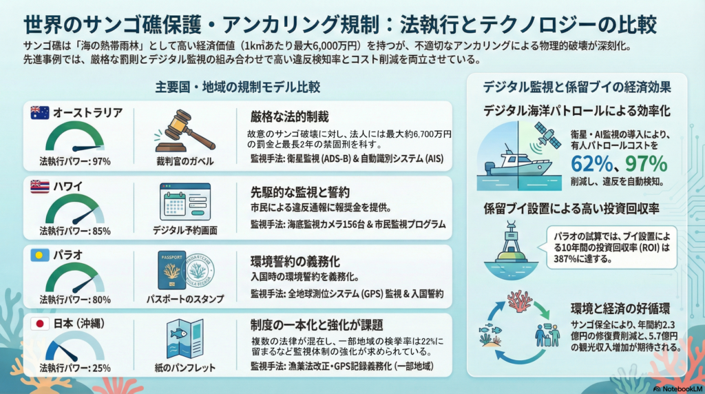 - 「犯罪」としての環境破壊と厳罰規定:オーストラリアではサンゴへのアンカリングに対し、個人に最大約1,400万円、法人に約7,000万円の罰金を科し、さらに禁錮刑を併用する「刑罰対象」として運用している。
