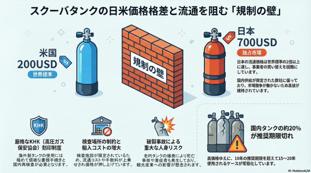 • 日米価格差の衝撃:米国では約23,000円(150〜200USD)程度で入手可能なアルミタンクが、日本では100,000円を超える定価で流通しています。この2倍から3倍以上の価格差が、小規模なダイビング事業者の設備投資(安全更新)を物理的に不可能にしています。