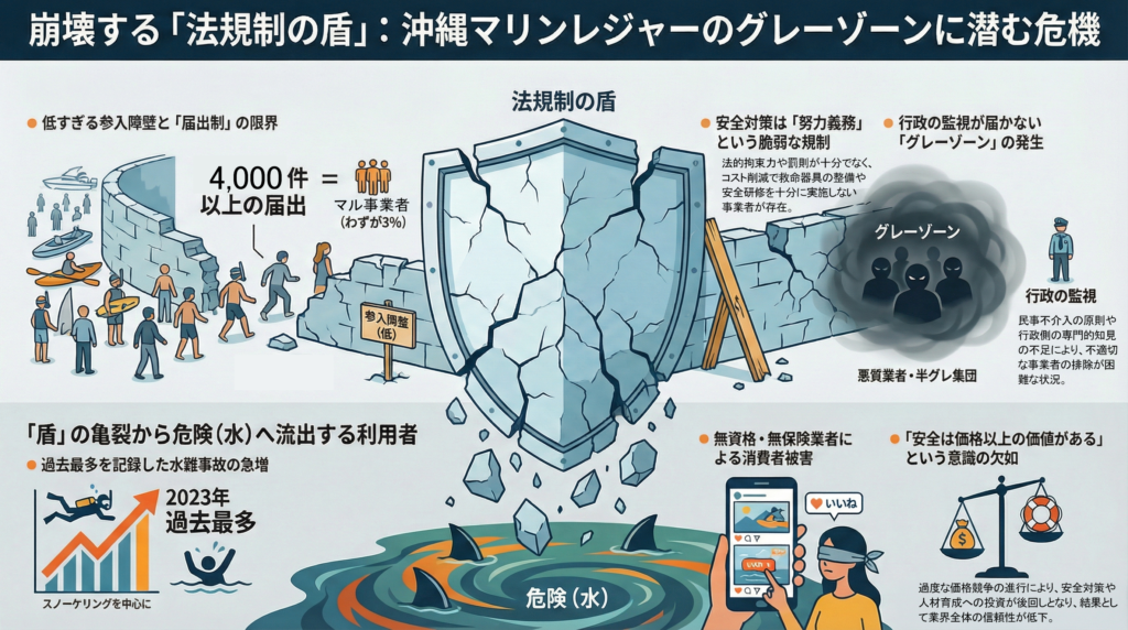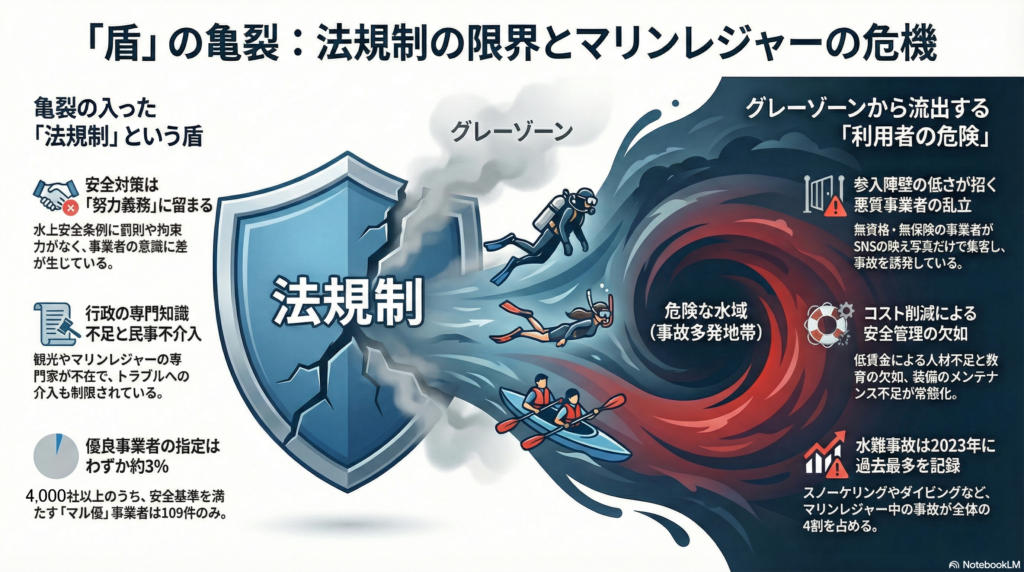 - 性善説に基づく届出制の限界: 水上安全条例に基づくマリンレジャー事業は、原則として「届出制」である。これは事業者の性善説に基づいた制度設計であり、悪質な事業者や安全意識の低い事業者の参入を未然に防ぐハードルとして機能していない現実がある。