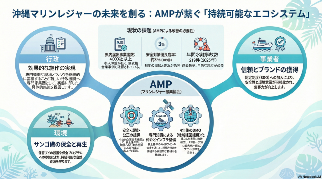 一般社団法人マリンレジャー振興協会(AMP)は、「安全と環境を基軸に、業界と行政をつなぐ中立的な第三者機関」と定義される。既存の法制度の限界を補完し、実効性のある安全管理体制を構築するためには、AMPのような民間主導の認証機関が不可欠である。