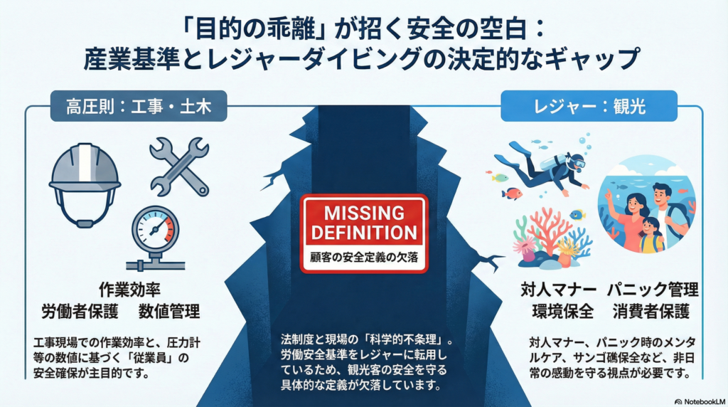 現在、日本のレジャーダイビングに適用されている主要な法的枠組みは「労働安全衛生法」および「高圧則」です。これらは元来、過酷な労働環境下での事故防止を目的に設計された「作業効率と労働者の安全」のための論理です 。しかし、観光業であるレジャーダイビングの本質は「顧客の感動体験」と「パニック管理を含む対人安全」にあります