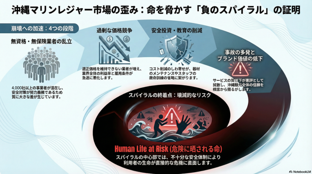 A3: 参入障壁が低く、現在沖縄には3,400〜4,000近い事業者が乱立しています 。価格競争が激化し、適切な安全コストを価格に転嫁できない「負のスパイラル」に陥っているためです
