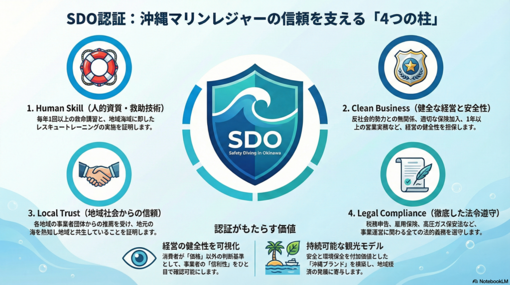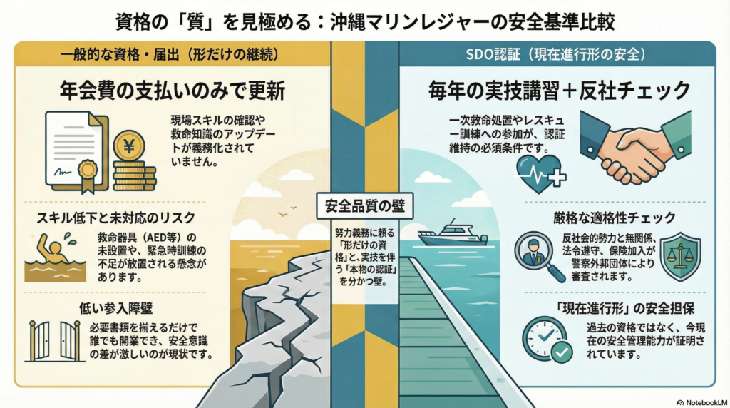 - 解決策: 沖縄マリンレジャーセイフティービューロー(OMSB)が認証する「SDO(Safety Diving in Okinawa)」制度は、毎年の救命救急・レスキュー訓練の受講と、警察機関による反社会的勢力排除を義務付けた国内最高水準の安全品質保証である。
