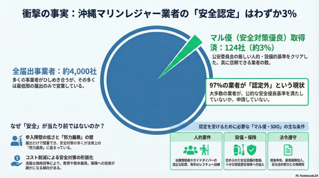 2025年の沖縄県内水難事故は219件(死者・行方不明者73人)に達し、安全管理の仕組み構築が急務となっている。 - 「マル優」による法的最低限の担保:沖縄県公安委員会が指定する「マル優事業者」は、水上安全条例に基づくコンプライアンス(税務・雇用保険・高圧ガス保安法等)と設備基準をクリアした法的基盤である。